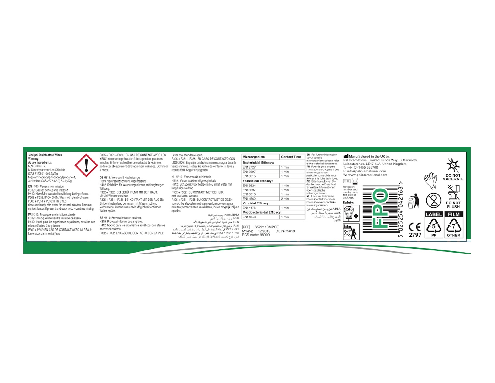 Medipal® Disinfectant Wipes are Bactericidal (including TB), Virucidal, Yeasticidal and Fungicidal. They are tested to a range of EN standards including EN13727, EN14476, EN14348, EN14561, EN14563. They are alcohol free and gentle on surfaces, making them suitable for everyday use. They can be used in combination with Medipal High Level Disinfectant Wipes in areas of particular high risk.