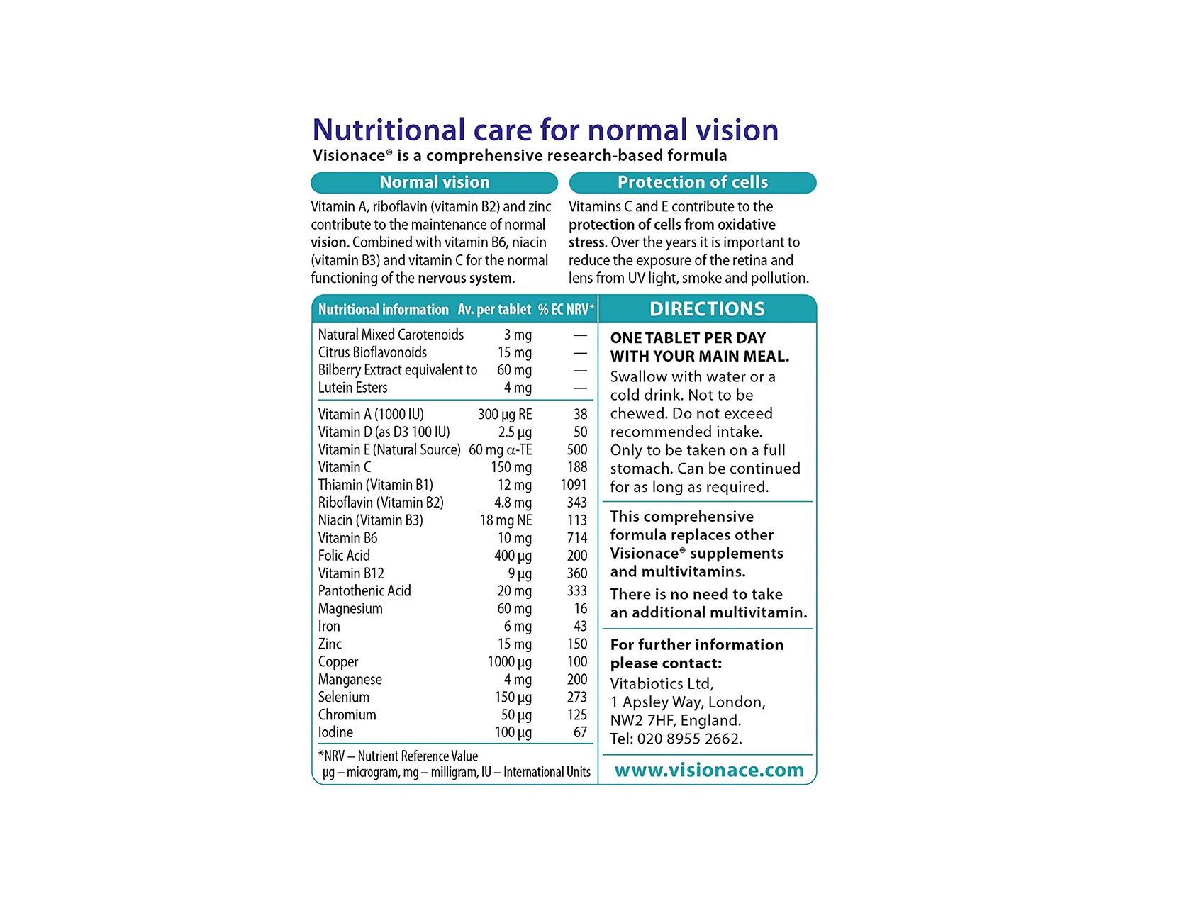 Visionance contains anti-oxidant vitamins C & E contribute to the protection of cells from oxidative stress. The retina and lens can be damages over the years by oxidative stress generates by UV light, smoke and pollution. Visionance is free from artificial colours, glutens, preservations, lactose, sugar, fat, salt, yeast and is suitable for vegetarians.